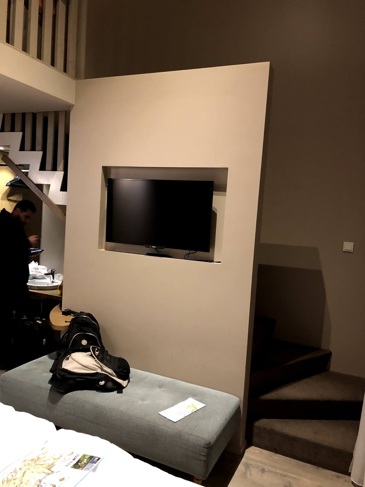 Pegamos um quarto para os quatro, sendo que tinha um mezanino com duas camas de solteiro e embaixo uma cama grande e confortável de casal, além de uma cafeteira, pia, cafés, chás, xícaras e no banheiro, enorme, shampoo e condicionador da marca L`occitane. Quando reservamos o hotel estava com o melhor valor disponível para 4 pessoas.