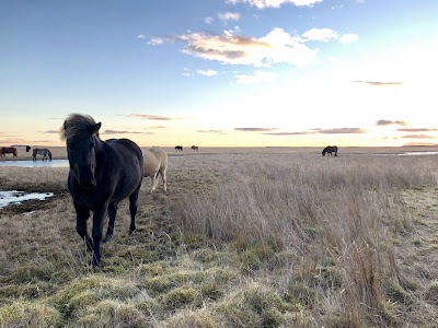 Seguimos na estrada em direção ao Vestrahorn para ver o pôr do sol de lá. A estrada estava cheia de cavalos lindos no meio do pasto. No meio do caminho o sol começou a se pôr e paramos em frente a um lago para ver e foi lindo.